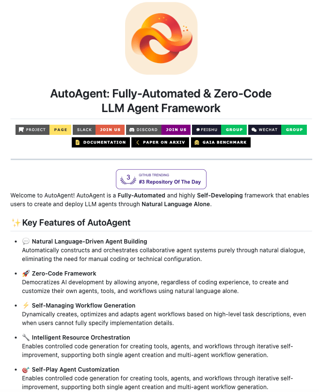 AutoAgent is a fully automated, zero-code LLM agent framework designed to execute end-to-end tasks from a high-level goal.
