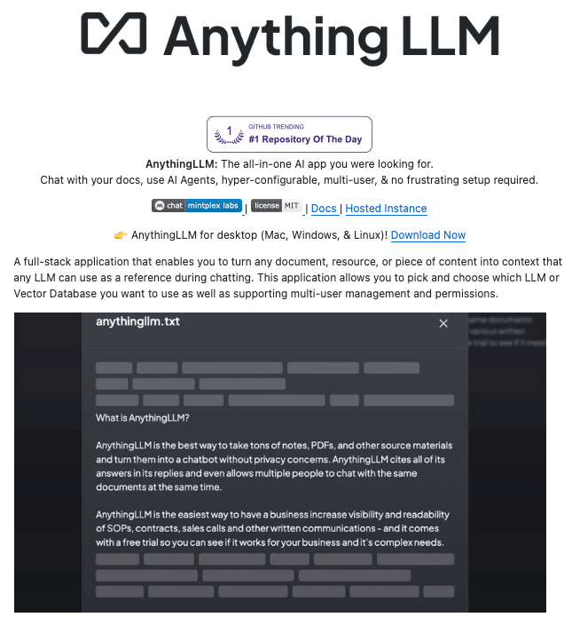 AnythingLLM is a self-hosted, all-in-one platform for building internal AI tools around documents, chat, and agents.