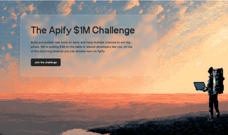 Apify is running the $1M Challenge. You can build and publish Actors for real-world use cases, with top projects earning up to $30K in cash prizes along with weekly rewards and community visibility.