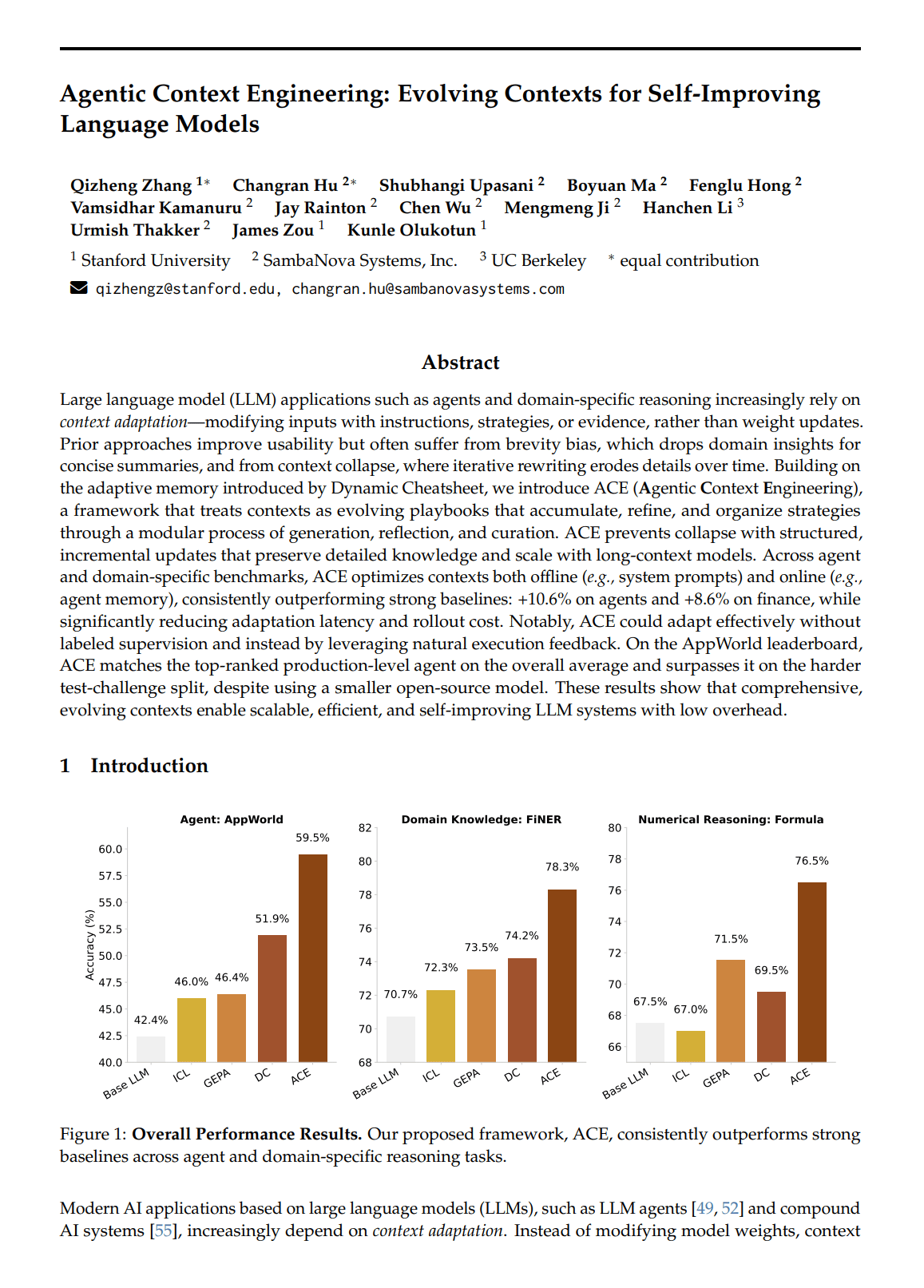 Stanford and SambaNova introduced Agentic Context Engineering (ACE), a framework that allows language models to self-improve without retraining their weights.