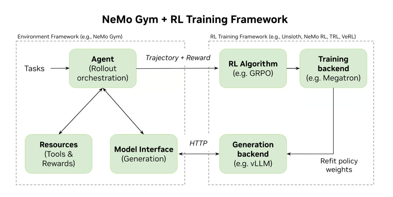 NeMo Gym is an open-source library that builds these environments and decouples them from training. You define what success looks like once. Then you can swap optimizers, change hardware, or scale to thousands of parallel rollouts without rewriting environment logic.