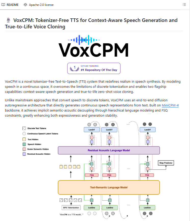 It is built on an end-to-end diffusion autoregressive architecture on top of MiniCPM-4 and trained on 1.8 million hours of bilingual audio. Instead of compressing speech into tokens, VoxCPM models audio directly in continuous space.