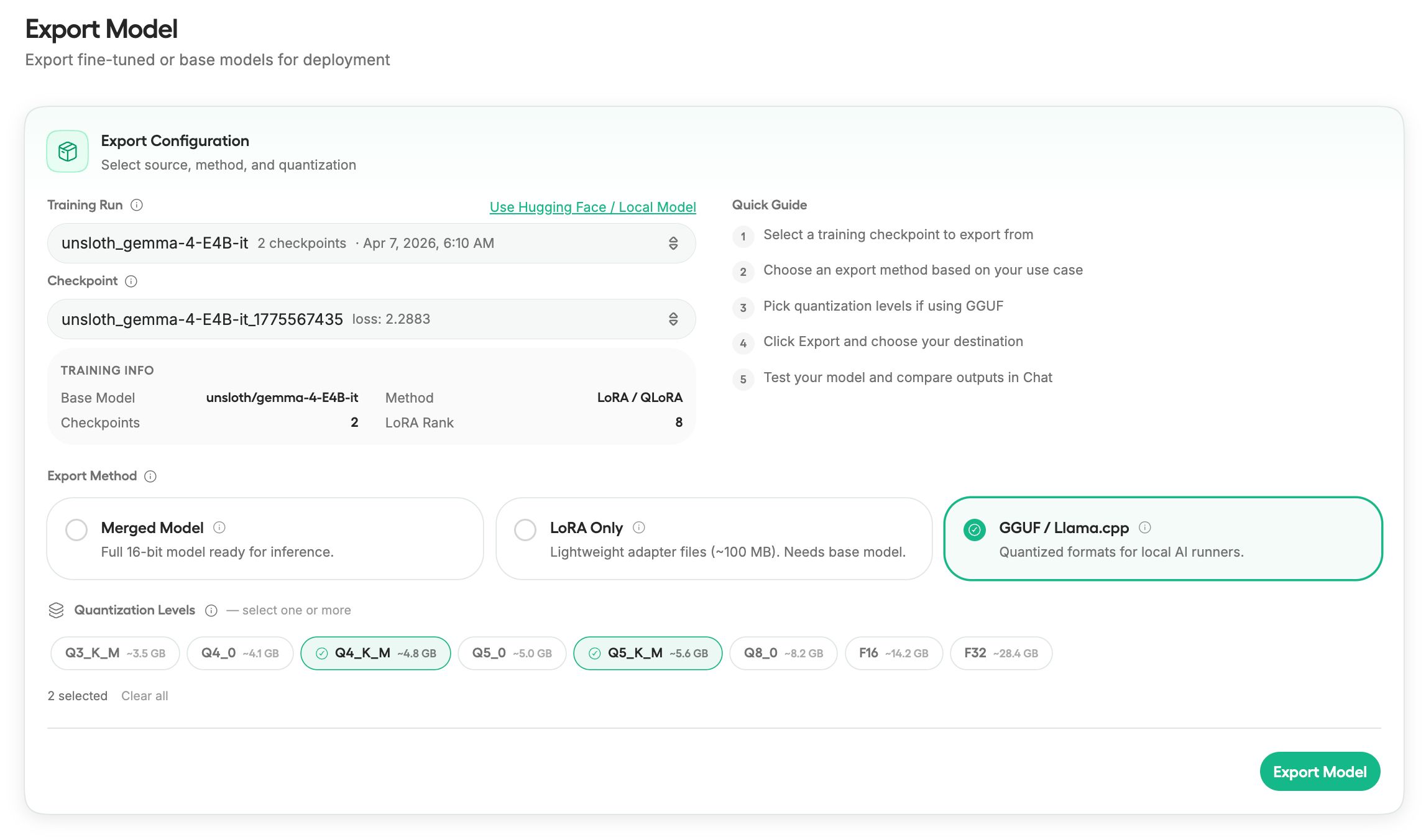 Unsloth Studio handles the entire workflow through a visual interface. No Python code required.