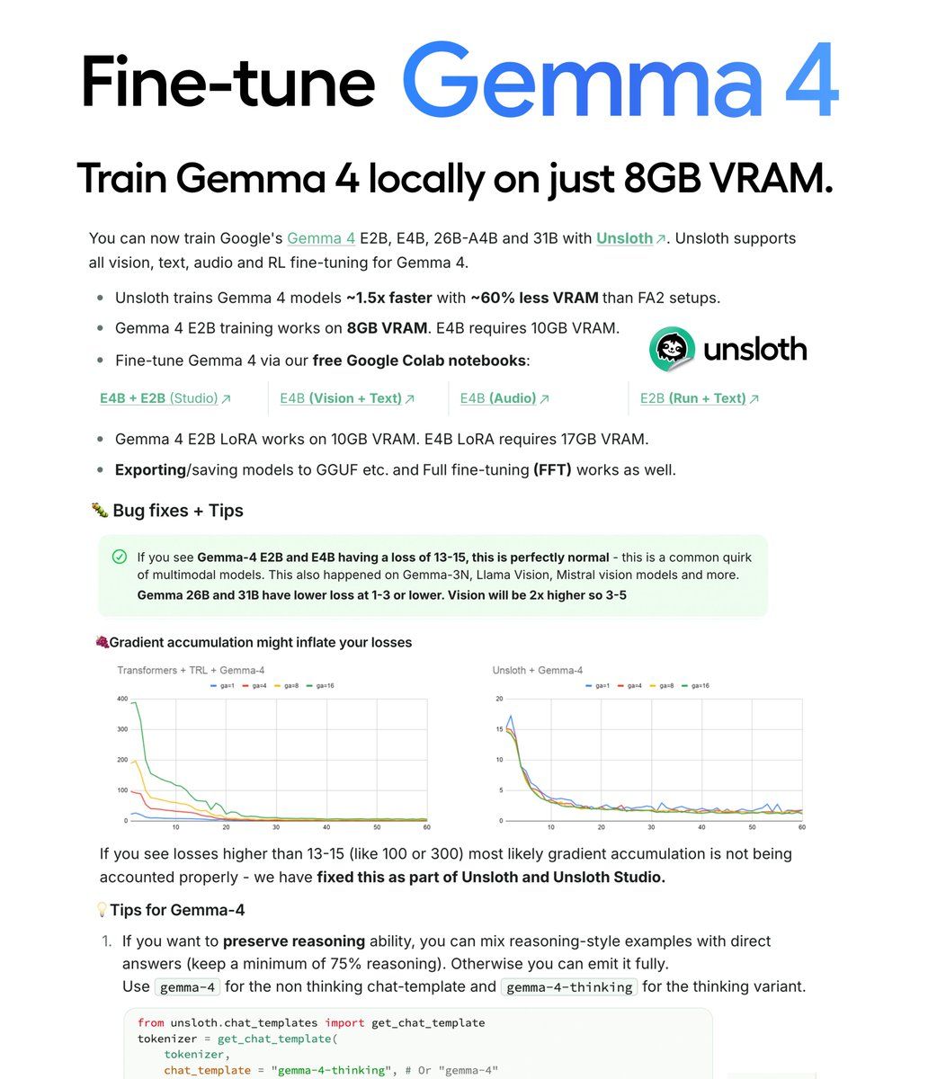 To preserve reasoning ability: Mix reasoning-style examples with direct answers. Keep a minimum of 75% reasoning examples in your dataset. Use the gemma-4-thinking chat template for larger 26B and 31B models.