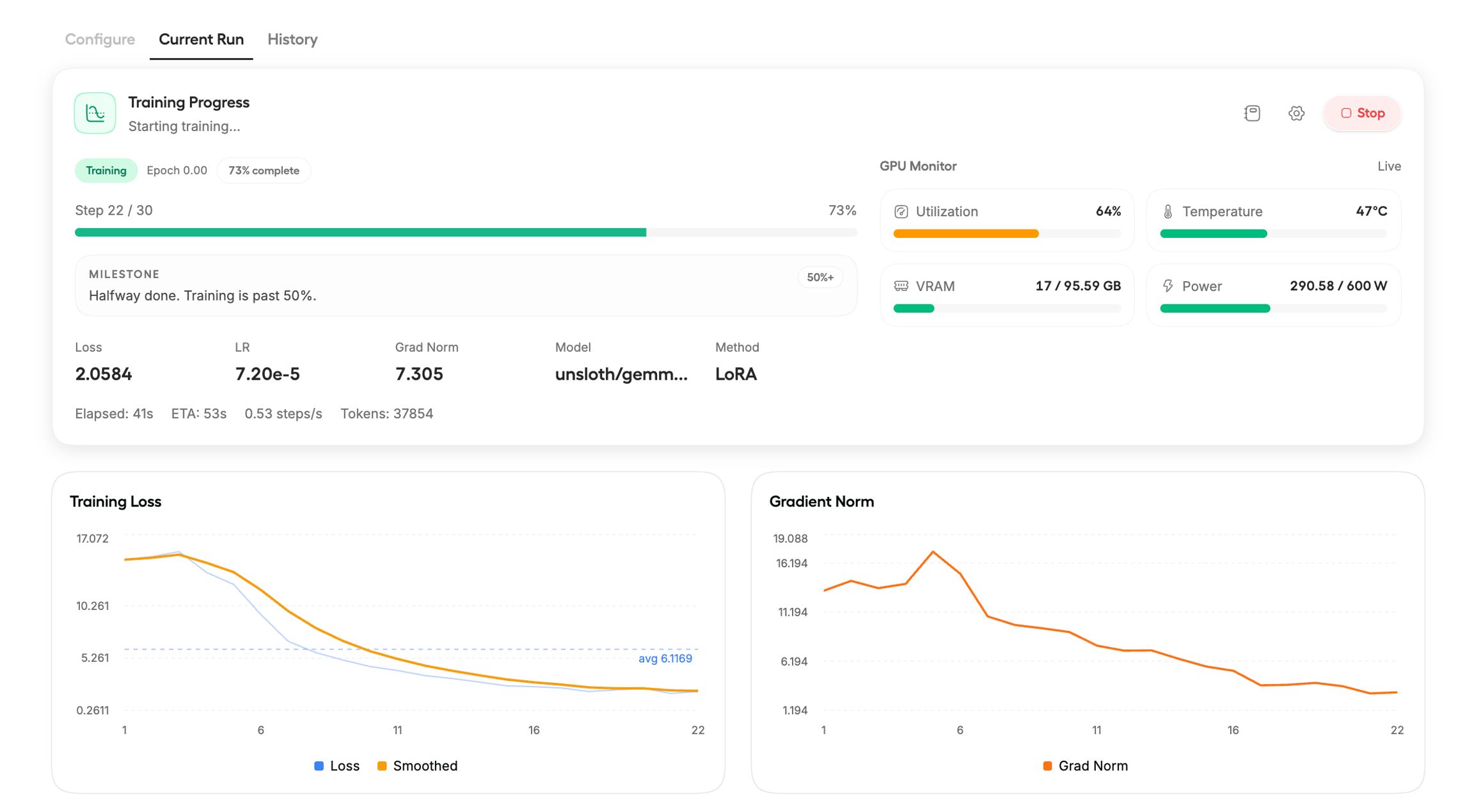 Training loss and gradient norm update in real time. A healthy run shows steadily decreasing loss.