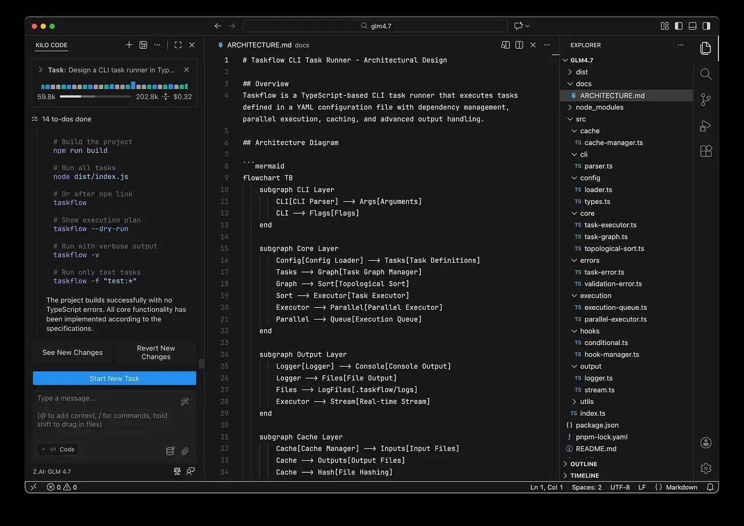 GLM 4.7 produced a 741-line architecture document, complete with Mermaid diagrams, detailed module boundaries, explicit algorithms (including Kahn’s algorithm for topological sorting), and a step-by-step implementation roadmap. It even included security and performance considerations.