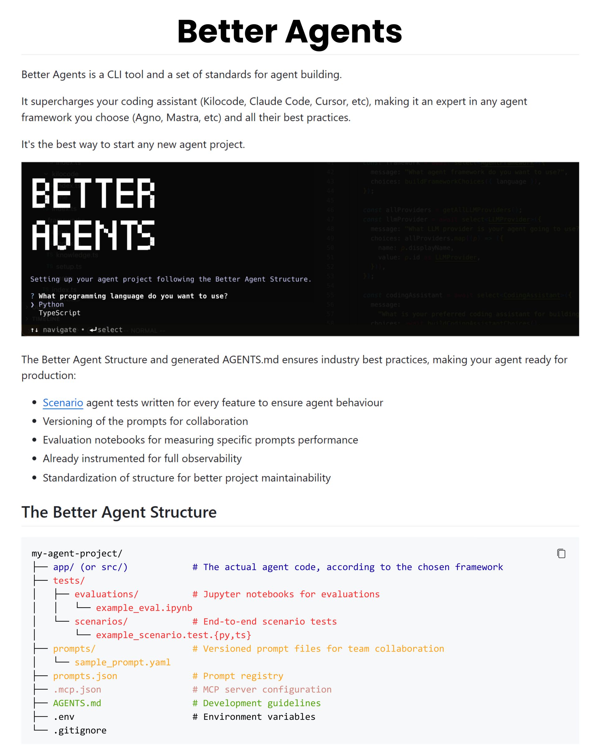Better Agents fixes this by giving you a clean project structure, versioned prompts, scenario tests, and a clear AGENTS.md that describes each capability and how it should be evaluated.