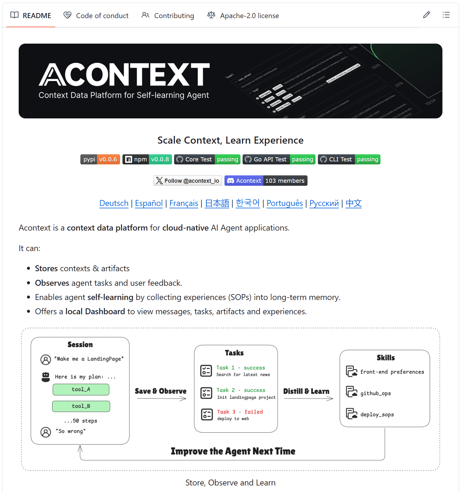 Acontext is an open source context data platform that simplifies context engineering by letting agents remember what they did, what worked, and what they learned.